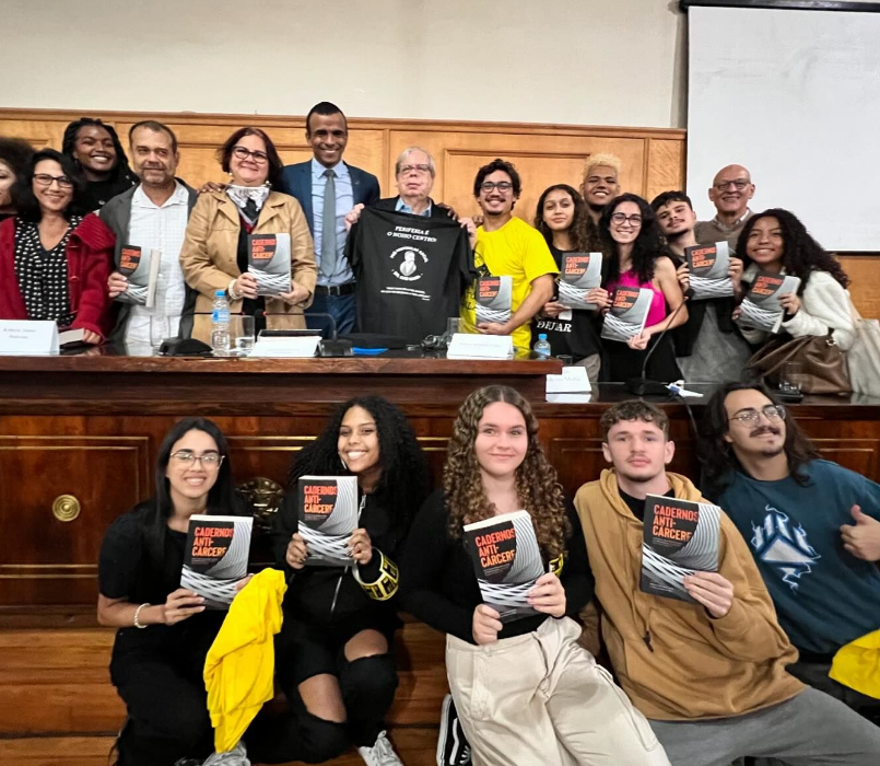 Na última segunda-feira, os membros da Clínica de Assistência Jurídica Popular Esperança Garcia (CJP) participaram do lançamento do livro “Cadernos Anti-Cárcere”, organizado pelos professores Wilson Madeira e Roberta Duboc Pedrinha, em homenagem ao professor Alfredo Dolcino Motta, que deu aula na UFF por 52 anos. Os integrantes do coletivo também passaram pelas salas de aula da faculdade de Direito para chamar os alunos a comparecer no evento.